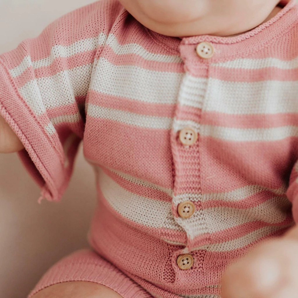 Feito em tricot delicado, com listrinhas suaves e acabamento impecável, é ideal para momentos especiais e também para o dia a dia. Uma peça atemporal para guardar com carinho na memória (e no álbum de fotos!).