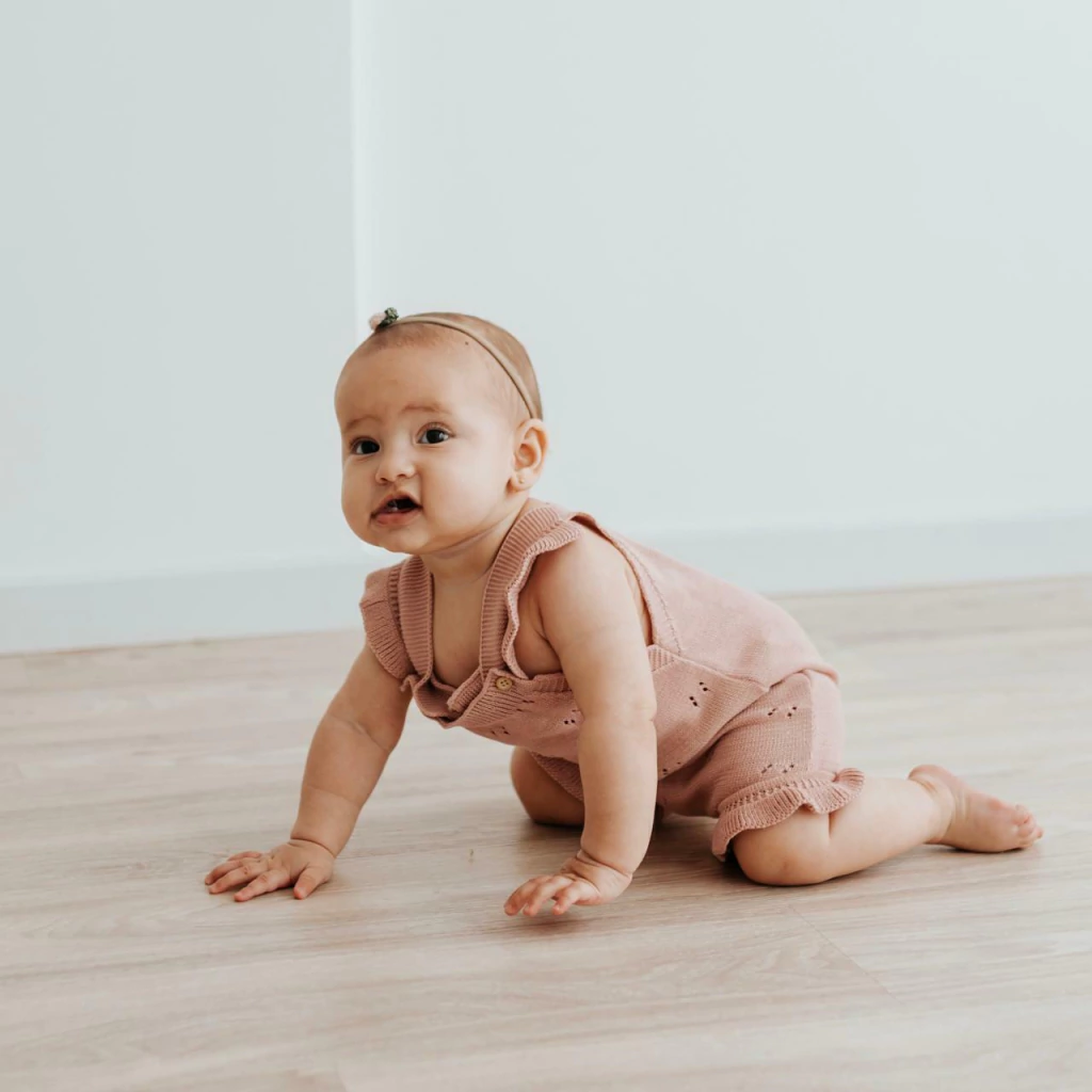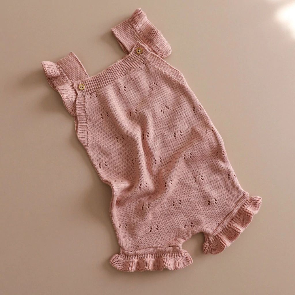 O Romper Rosa Pó é confeccionado em tricô macio, com acabamento delicado e toque suave para a pele do bebê. Os babadinhos nas alcinhas e os botõezinhos de madeira trazem um charme especial e artesanal à peça, enquanto o tom rosado evoca leveza e ternura.